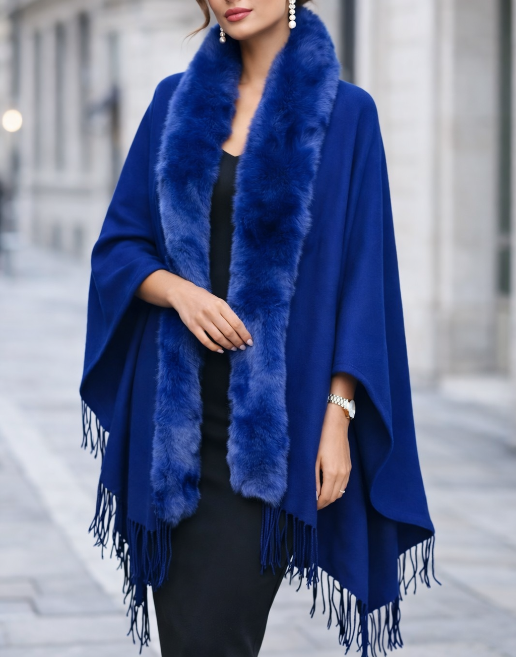 Découvrez notre écharpe poncho en fausse fourrure de couleur bleu roi, une pièce incontournable pour allier style et chaleur cet hiver.